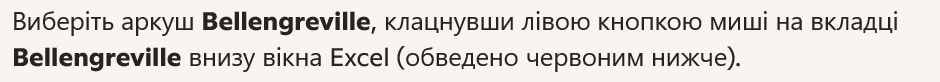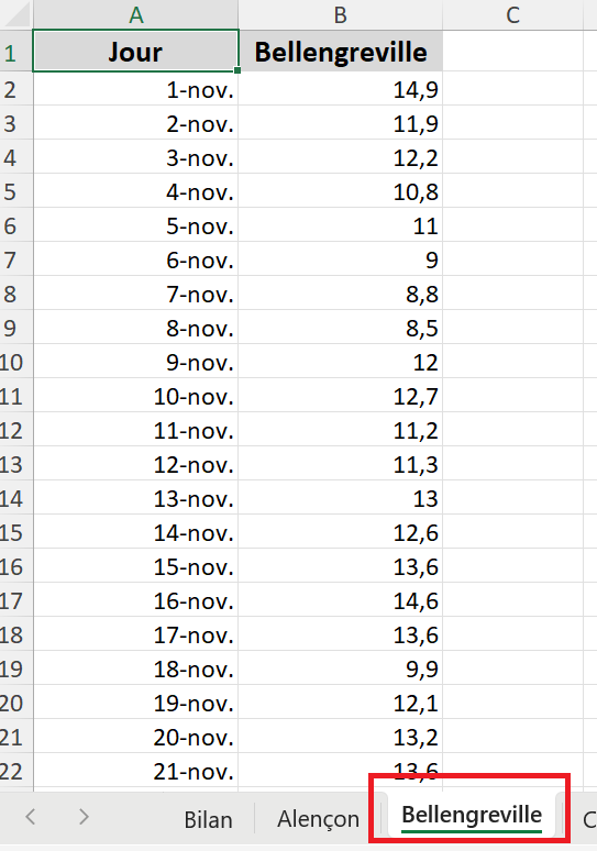 - Select the Bellengreville sheet by left‑clicking on the Bellengreville tab at the bottom of the Excel window (highlighted in red below).