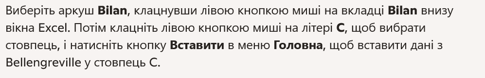 - Select the Bilan sheet by left‑clicking on the Bilan tab at the bottom of the Excel window. Then left‑click on the letter C to select the column, and left‑click the Paste button in the Home menu to paste the Bellengreville data into column C.