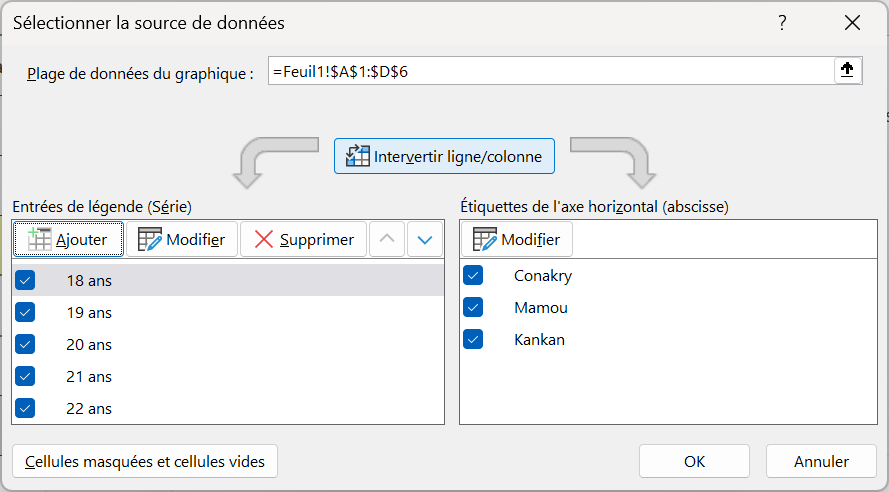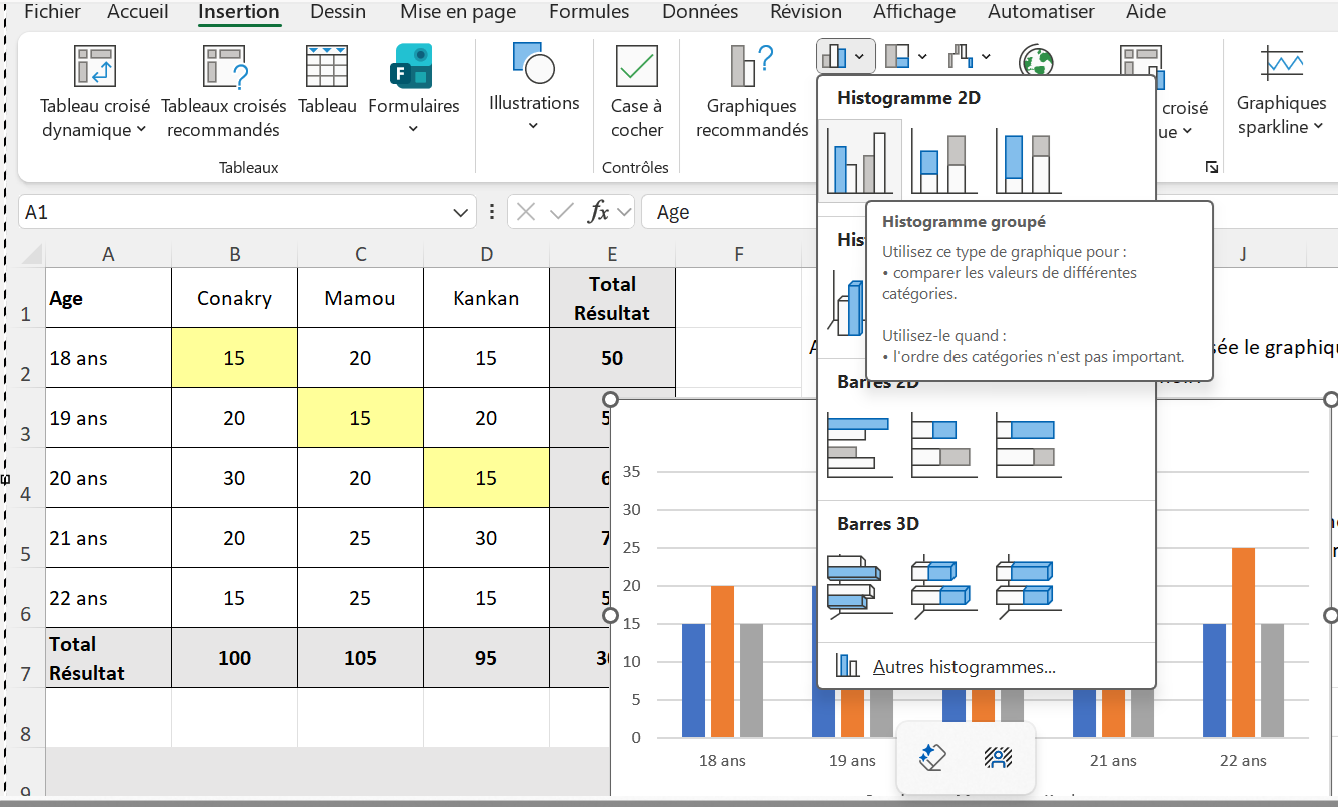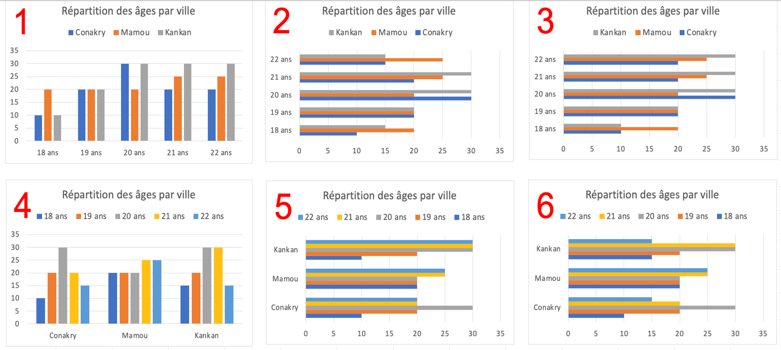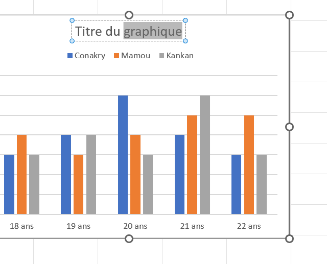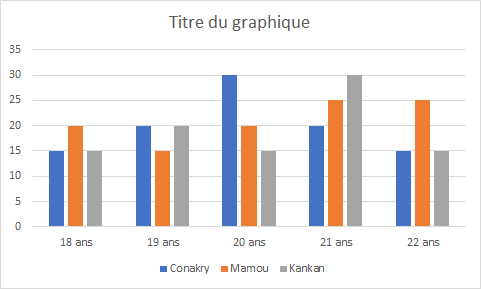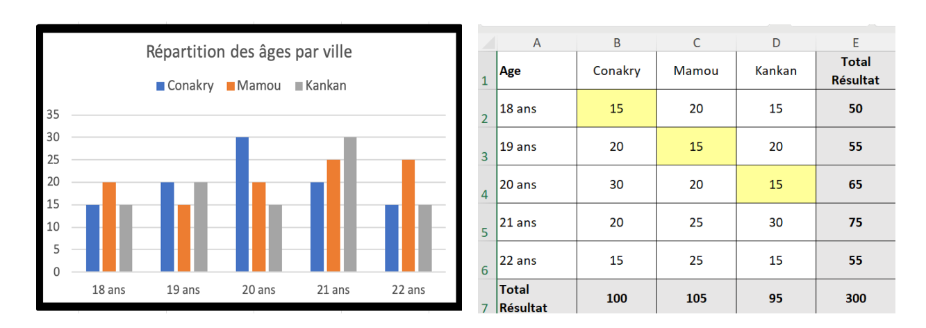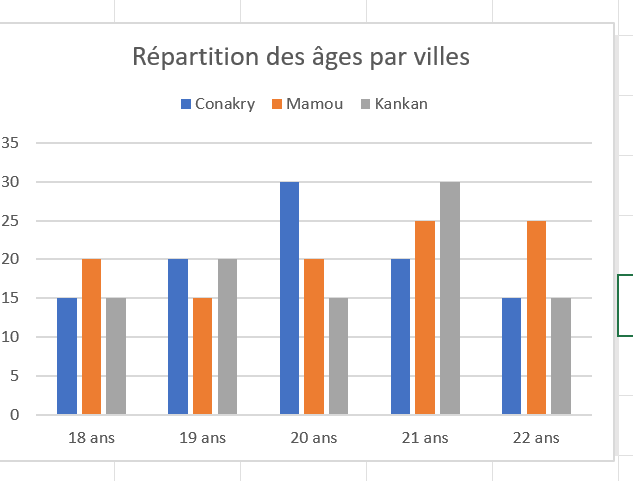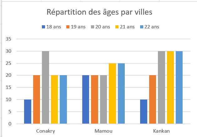 - Double-cliquer sur Titre du graphique ( à gauche ci-dessous) et remplacer le texte par Répartition des âges par villes, vous devez obtenir la vue à droite ci-dessous:
