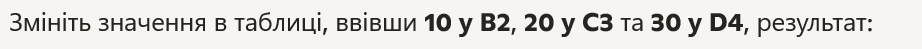 - Change the values in the table by entering 10 in B2, 20 in C3, and 30 in D4, result:
