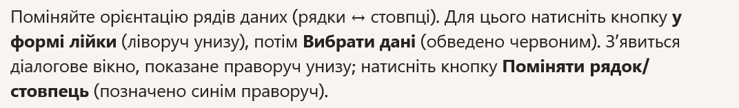 - Switch the orientation of the data series (rows ↔ columns). To do this, click the funnel‑shaped button (on the left below), then click Select Data (outlined in red below). The dialog box shown on the right below will appear; click the Switch Row/Column button (in blue on the right below).