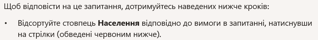 - Sort the Population column as requested in the question by clicking on the arrows (circled in red below).