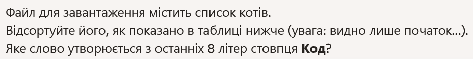 What word is formed by the last 8 letters of the Code column?