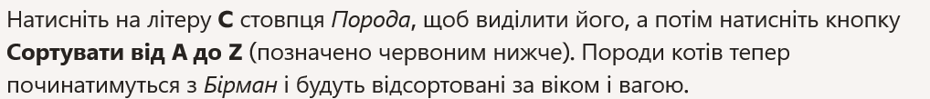 6. Click on the C of the Race column to select it, then click the Sort A to Z button (shown in red below). The cat breeds will now start with Birman and will be sorted by age and weight.