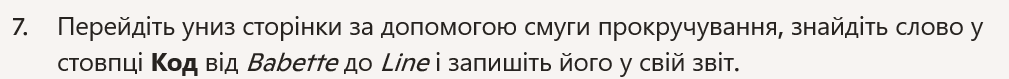 7. Go to the bottom of the page using the scroll bar, identify the word in the Code column from Babette to Line, and write it down in your report.