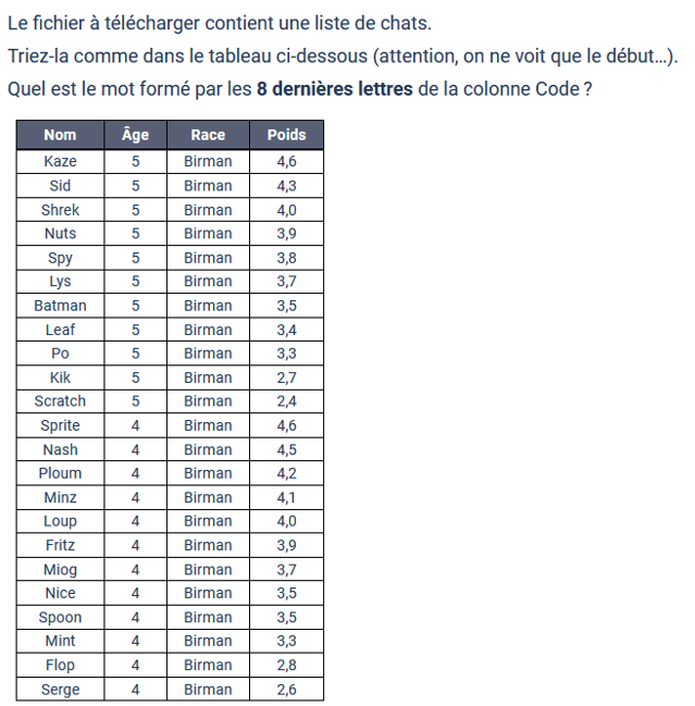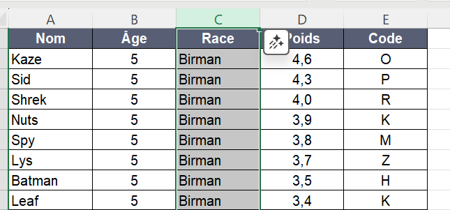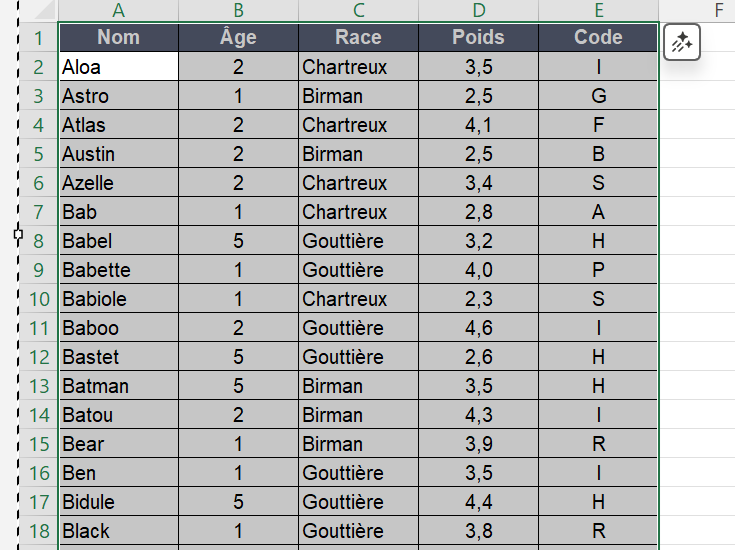 Cliquer sur le C de la colonne Race pour la sélectionner puis sur le bouton trier de A à Z ( en rouge ci-dessous), la race des chats commencent par Birman et sont classés par âge et poids: