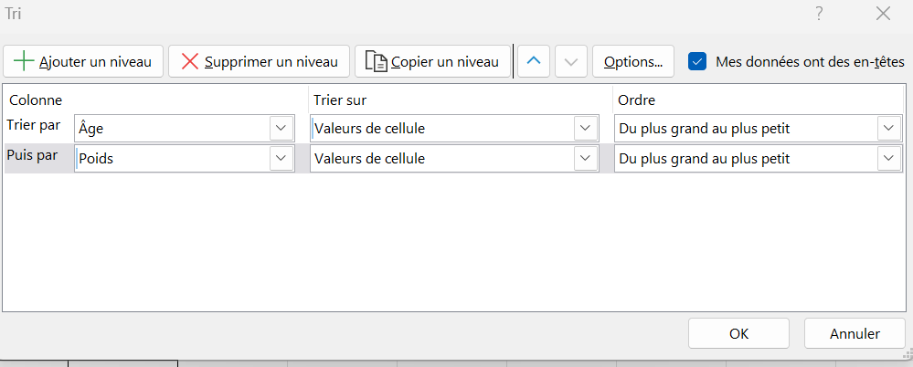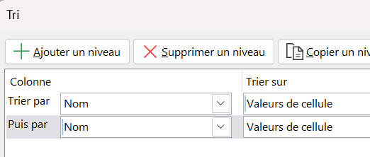 Ajouter deux niveaux de tri en cliquant sur +Ajouter un niveau: