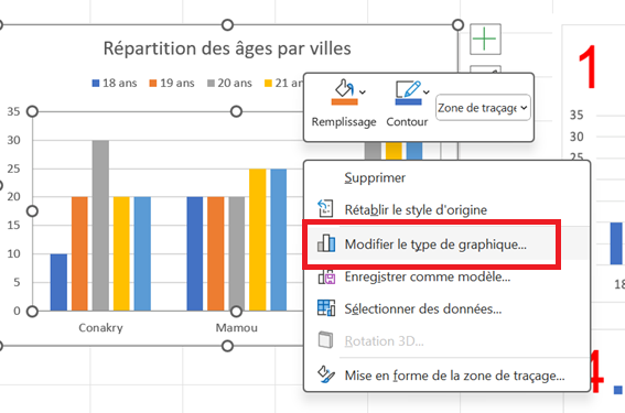 - Cliquer droit sur le graphique et choisir Modifier le type de graphique ( ci-dessous à gauche) , Choisir un type Barres ( ci-dessous à droite) :