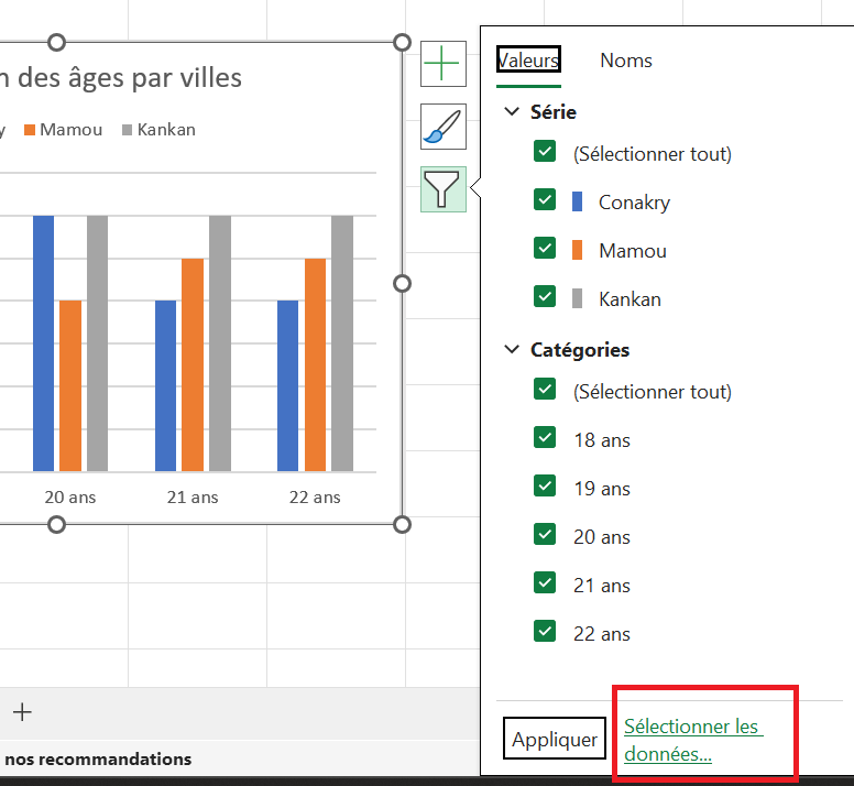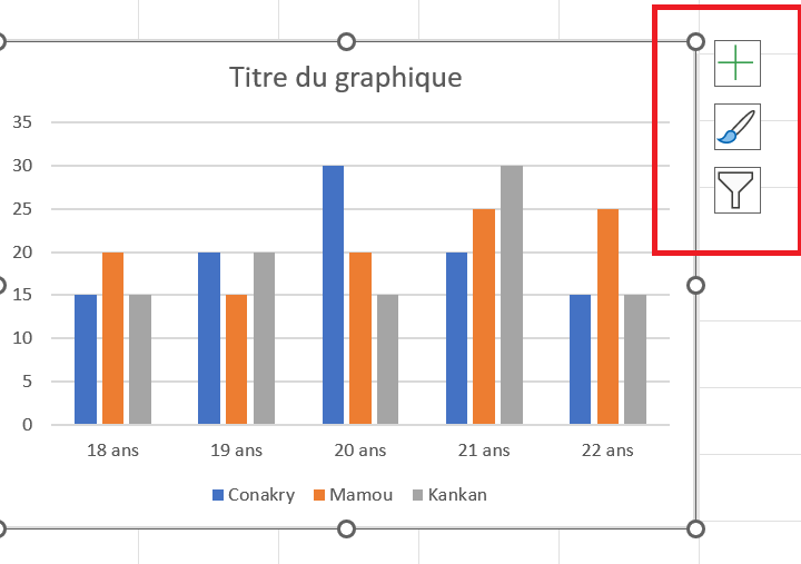 - Déplacer votre graphique en zone grisée ( située à gauche en dessous du tableau de données), lorsque le graphe est sélectionné il apparaît les 3 boutons (encadrés en rouge ci-dessous), ces boutons permettent de reconfigurer différemment le graphique: