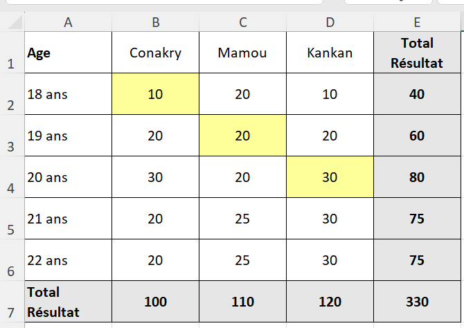 - Modifier les valeurs du tableau en mettant 10 en B2, 20 en C3 et 30 en D4, résultat: