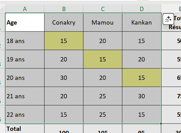 - Sélectionner les cellules de A1 à D6,