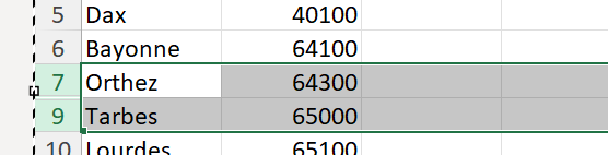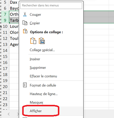 La ligne 8 est masquée, sélectionner les lignes 7 et 9 qui entourent la ligne 8 masquée, faire un clic-droit puis