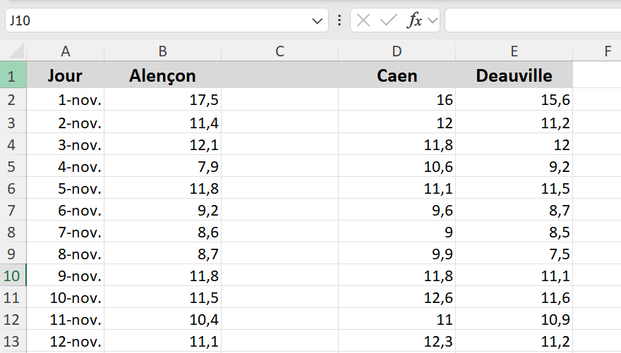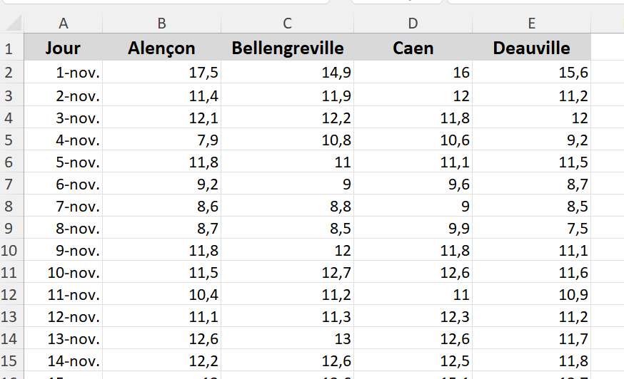 Odile has prepared a file containing the maximum temperatures for November 2016 in 4 cities.