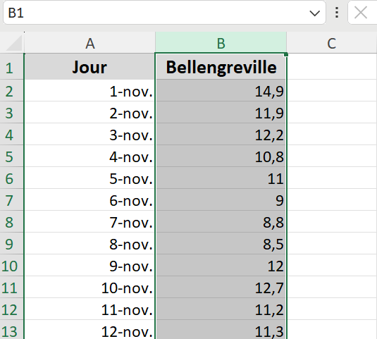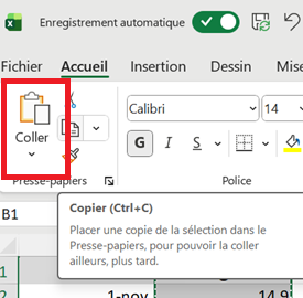 - Cliquer gauche sur le B pour sélectionner la colonne Bellengreville puis sur le bouton Copier du menu Accueil (entouré en rouge ci-dessous):