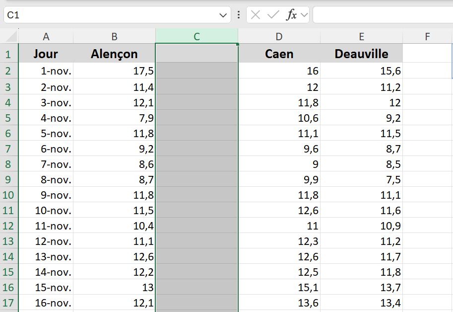 • Insert a column between Alençon and Caen, and copy into it the data from the Bellengreville sheet.