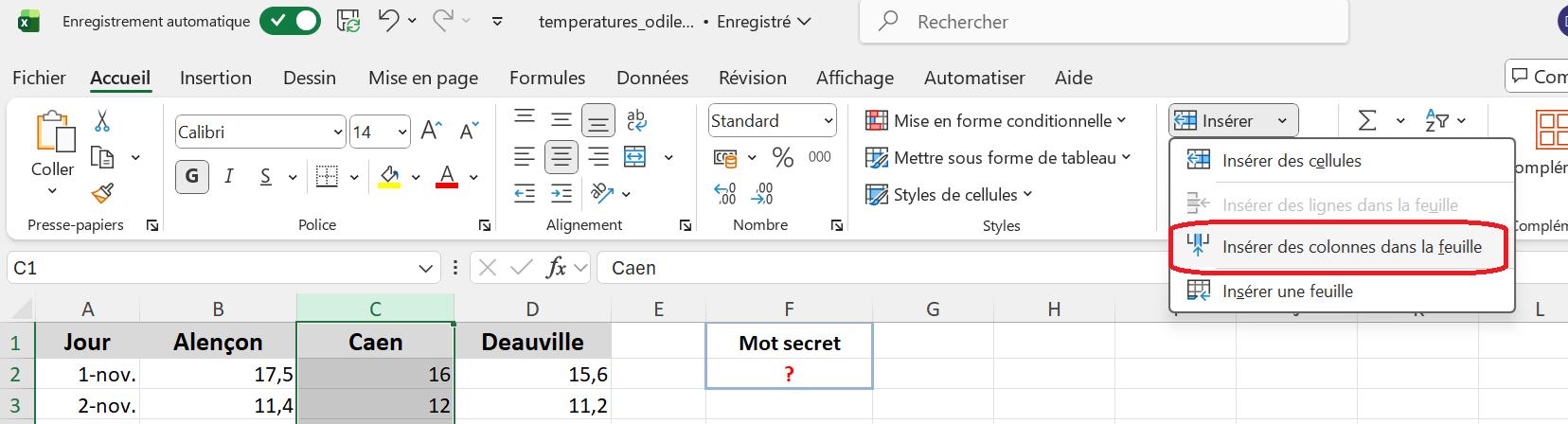 - cliquer gauche sur le bouton insérer du menu Accueil puis choisir Insérer des colonnes dans la feuille ( en rouge ci-dessous):