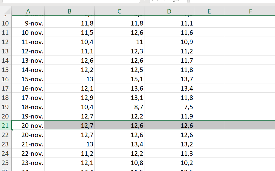 • The row for November 20 is duplicated. Delete one of the two rows.