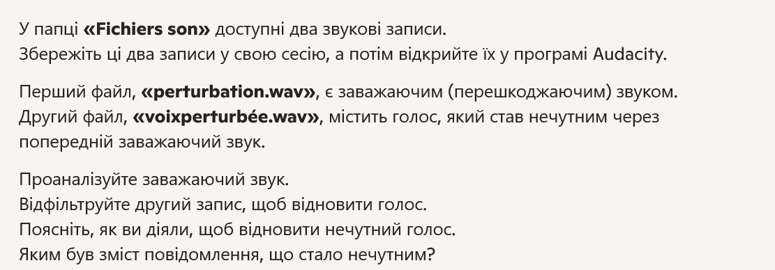 The second file ( click-here), “voixperturbée.wav”, is a voice that has become inaudible because of the previous interfering sound.