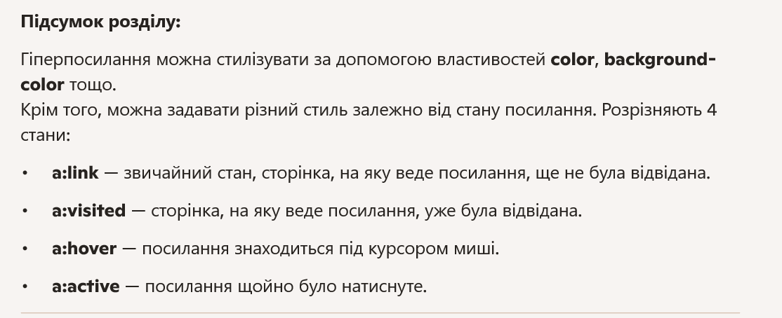 Налаштуйте у вашому файлі mystyle.css стиль для різних можливих станів ваших гіперпосилань.