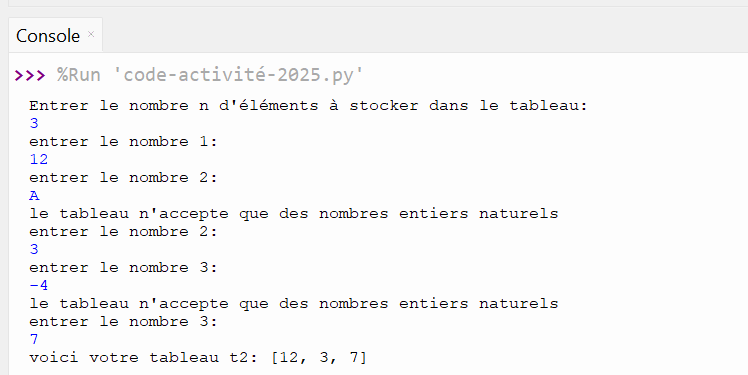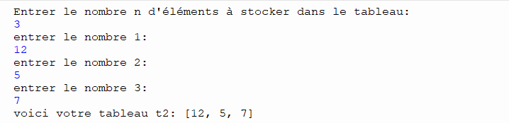 a. Proposer le code d'un programme qui demande n nombres entiers naturels à l'utilisateur du programme et les stockent dans un tableau t2, la valeur de n est choisie par l'utilisateur du programme durant l'exécution du code (voir un exemple rendu ci-dessous):
