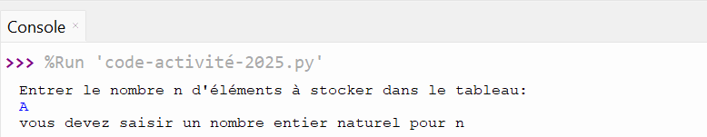 c. Ajouter une programmation défensive qui refuse la saisie si cette dernière n'est pas un nombre entier naturel, le programme ne doit pas s'interrompre ( exemple de rendu):