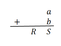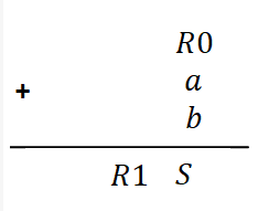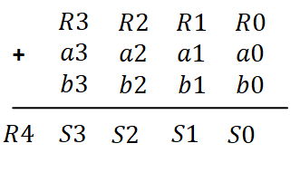 Soit l'addition entre deux données a et b de taille 1 bit, on appelle S la somme et R la retenue éventuelle, l'addition s'écrit: