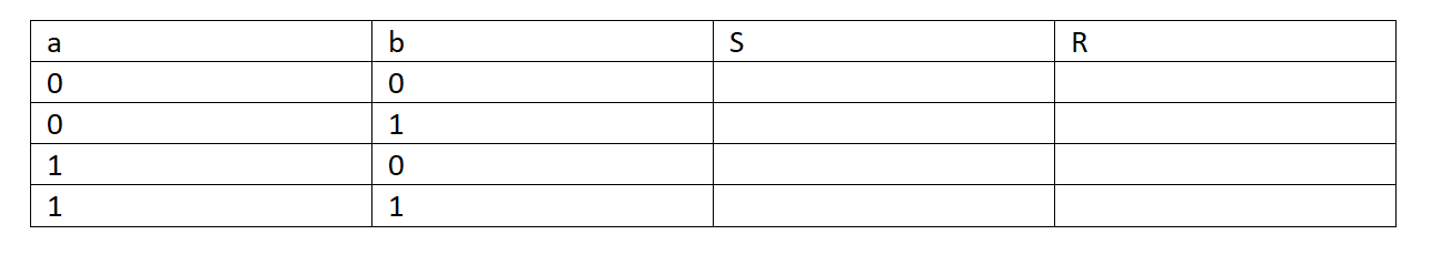 1. Compléter la table de vérité de l'addition entre les deux données a et b de taille 1 bit, on appelle S la somme et R la retenue: