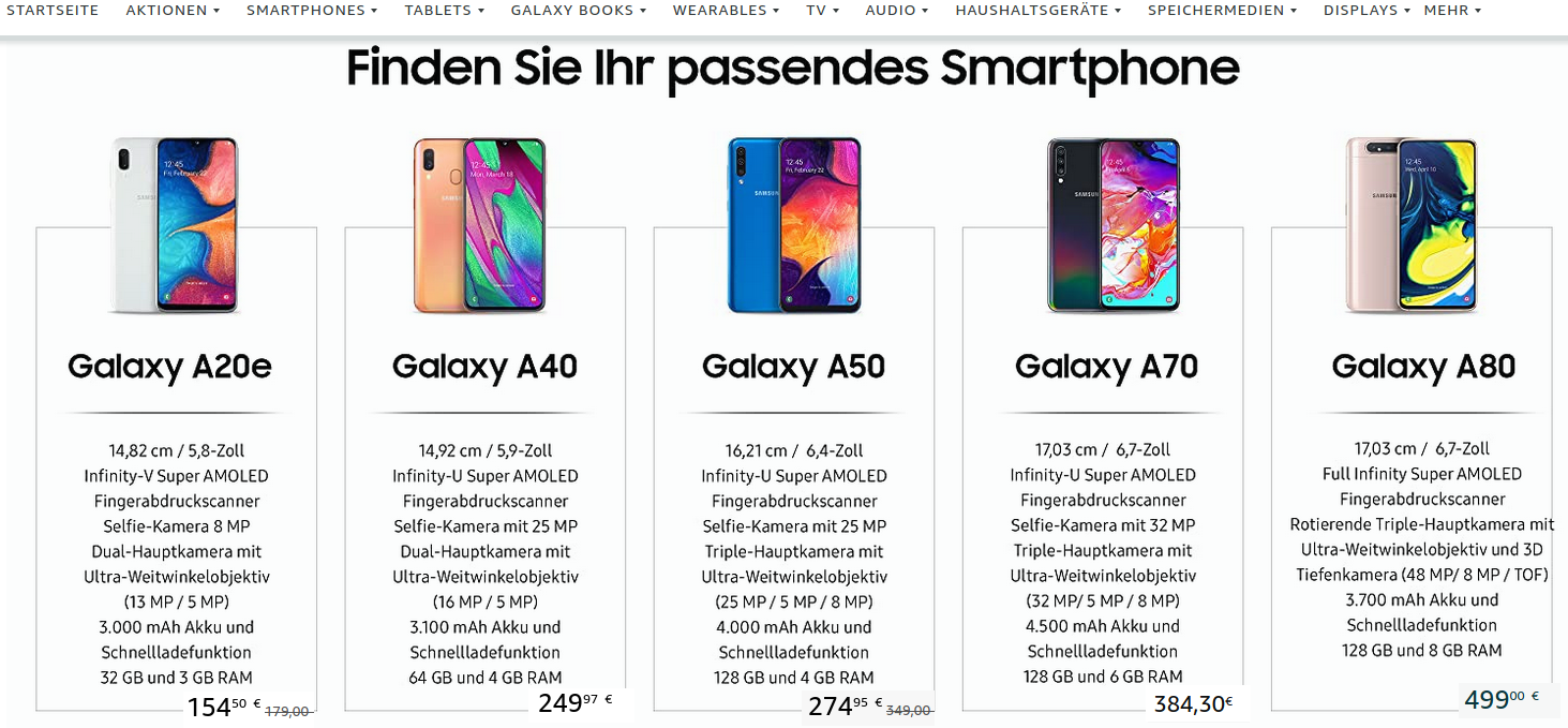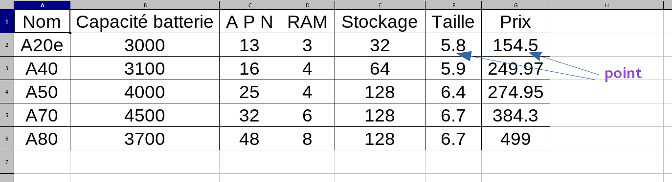 [{'Nom': 'A20e', 'Capacité batterie': '3000', 'A P N': '13', 'RAM': '3', 'Stockage': '32', 'Taille': '5.8', 'Prix': '154.5'}, {'Nom': 'A40', 'Capacité batterie': '3100', 'A P N': '16', 'RAM': '4', 'Stockage': '64', 'Taille': '5.9', 'Prix': '249.97'}, {'Nom': 'A50', 'Capacité batterie': '4000', 'A P N': '25', 'RAM': '4', 'Stockage': '128', 'Taille': '6.4', 'Prix': '274.95'}, {'Nom': 'A70', 'Capacité batterie': '4500', 'A P N': '32', 'RAM': '6', 'Stockage': '128', 'Taille': '6.7', 'Prix': '384.3'}, {'Nom': 'A80', 'Capacité batterie': '3700', 'A P N': '48', 'RAM': '8', 'Stockage': '128', 'Taille': '6.7', 'Prix': '499'}] |