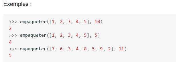 Compléter la fonction Python empaqueter(liste_masses, c) suivante pour qu’elle