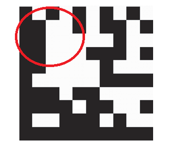 Le DataMatrix est composé d’une marge pour que le lecteur puisse se repérer, et d’une matrice ( un tableau à 2 dimensions) permettant d’y insérer les données sous forme de code :