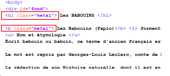 Dans le HTML, on veut qu'un titre (balise h1) et un texte gras ( balise b) soient de la classe metal:
