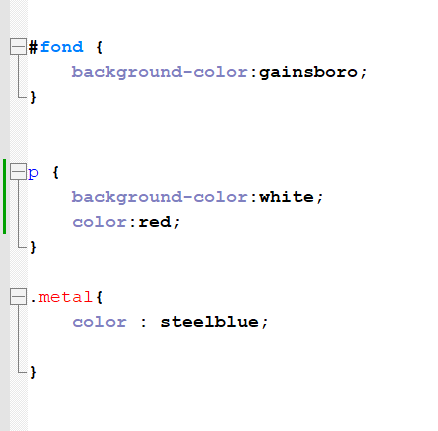 Les règles CSS on définit la règle pour la classe metal ( un nom de classe commence par un . dans le fichier css), ici on définit que les éléments de cette classe doivent avoir le texte de couleur steelblue ,