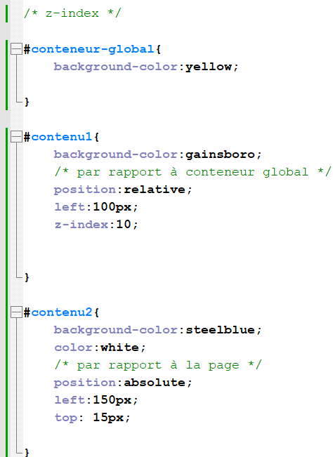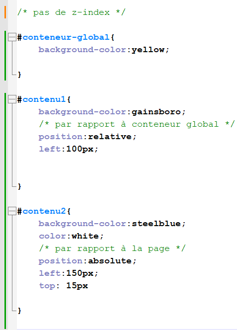 Par défaut, tous les éléments sont à la même profondeur. Pour en placer un devant un autre, il suffit d’utiliser la propriété z-index, Plus la valeur est grande, plus l’élément est devant.
