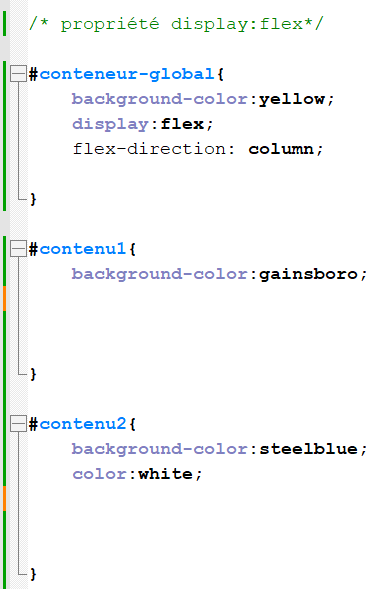 Il y a différents paramètres qui peuvent être indiqués pour gérer le positionnement. Si les éléments doivent se positionner en colonne et non en ligne, alors la syntaxe du CSS sera flex-direction:column :