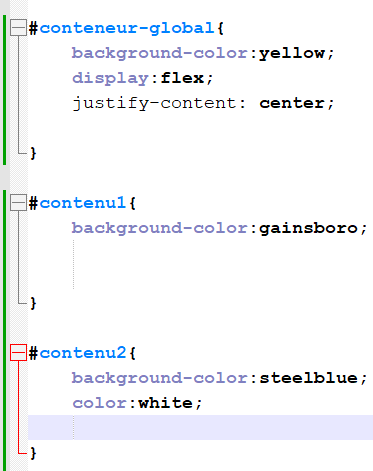 Une dernière commande, justify-content, va permettre d’organiser les éléments horizontalement en les faisant s’aligner à gauche du conteneur avec flex-start ou en les alignant à droite avec flex-end. Ils peuvent être centrés avec center.