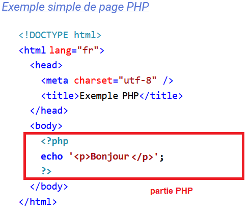 La partie entourée dans la page HTML à l’intérieur des balises <?php et ?> est du code PHP . Sur cet exemple simple, le code PHP se contente d’afficher un texte statique « Bonjour » grâce à la fonction PHP echo ; dans un programme PHP plus traditionnel, ce texte serait généré dynamiquement en fonction de l’identification de l’utilisateur.