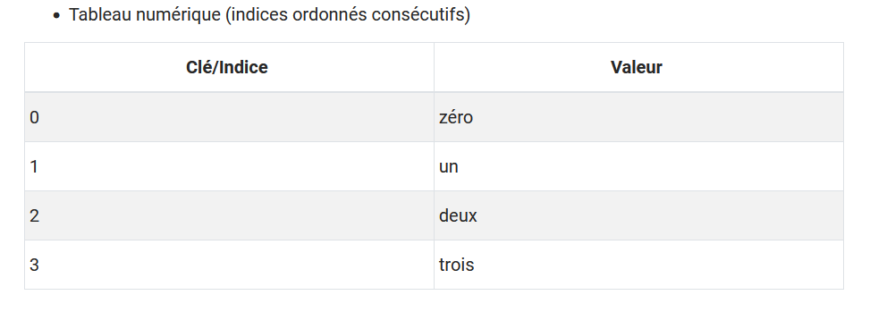 $nombres = array('zéro','un','deux','trois', 5 => 'cinq','six','un' => 1,'sept',-1 => 'moins un');