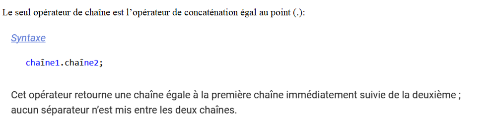 - chaîne de caractères, exemple: 'bonjour' ou "bonjour", une chaîne de caractères est délimitée par des apostrophes simples ou doubles (au choix).