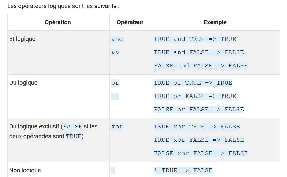 - booléen, le type booléen comporte deux valeurs : TRUE (ou true) et FALSE (ou false).