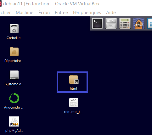 1. Sur le serveur Virtuel, un lien vers le dossier /var/www/html ( entouré en bleu ci-dessous) vous permettra d'accéder aux fichiers du site web.