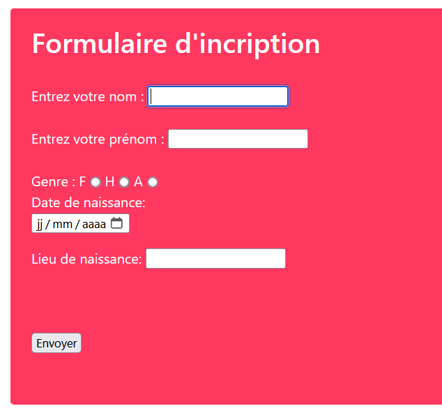 Côté html, le champ de saisie du nom est associé à une variable qui est donnée dans l'attribut name d'une la balise <input> de type='text' (champ de saisie), ci dessous name="nom"