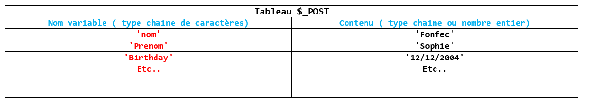 Pour manipuler les éléments du tableau coté php, on peut par exemple affecter à une variable php appelé $nom le contenu de la case du tableau qui contient la valeur du champ nom, cette case s'appelle $_POST['nom'], cette affectation se programmera: