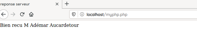 Ici vous pouvez voir que le destinataire du formulaire s'appelle myphp.php, c'est le nom du fichier que va charger le serveur web pour traiter les données du formulaire. C'est un fichier qui contient du code php interprété par le serveur web.