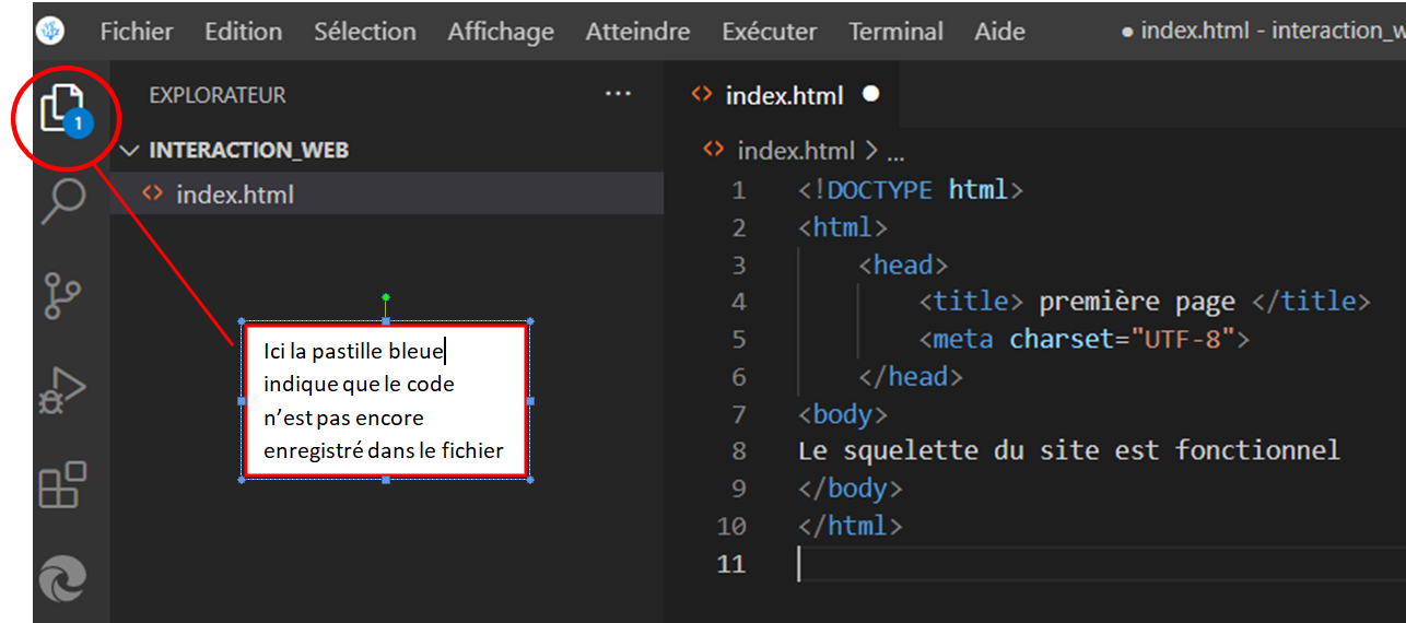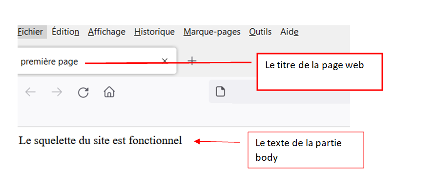 - Copier-coller, dans la zone de code, le squelette de page web ci-dessous :