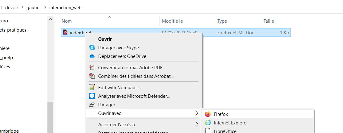 - Pour tester vous allez utiliser le navigateur Firefox, rendez-vous dans votre dossier "interaction web", Faire un clic droit sur le fichier index.html puis sélectionner Ouvrir avec Firefox: