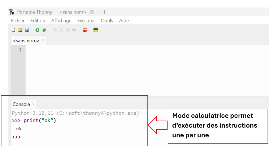 Vous utiliserez l'éditeur Thonny pour coder en mode dit calculatrice et l'éditeur VS Code (portable) pour développer vos programmes en mode script , les logiciels se trouvent dans le dossier "logiciels par discipline" du bureau puis le sous dossier "logiciels de NSI/SNT" .