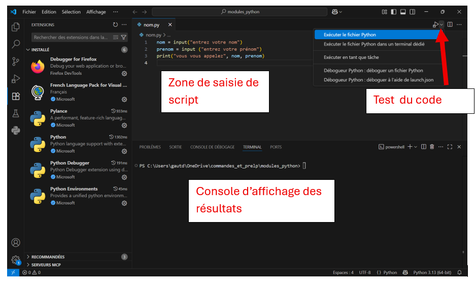 Dans cette partie vous allez utiliser VS Code ( portable) et vous écrirez dans la zone de script: