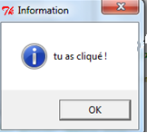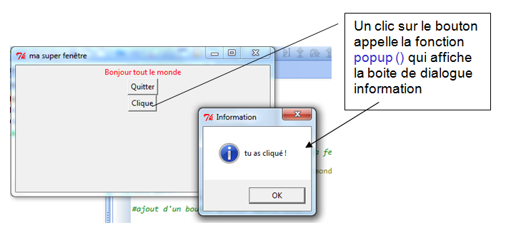 Les boites de message Windows sont des fenêtres particulières prêtes à l'emploi. Elle se trouve dans Tkinter, ici la boite de message voulue est générée par la fonction « showinfo()» du module messagebox du package tkinter. Voici la définition de notre méthode "popup()" qui demande la création d'une boite de message de type "showinfo()" configurée pour afficher le message montré ci-dessus: