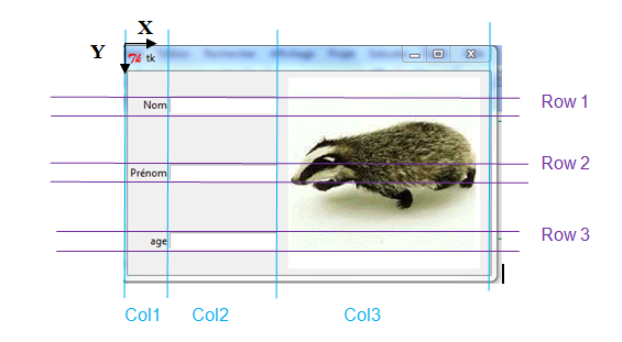 Ci-dessous, vous voyez la grille avec ses colonnes ( Col ) et ses lignes ( Row ), un élément placé dans une cellule peut être positionné avec une marge, c'est le cas de l'image du blaireau. Les textes dans les labels peuvent être alignés à droite, à gauche, en haut ou en bas de la case où ils sont placés, dans l'exemple les textes sont alignés à droite: