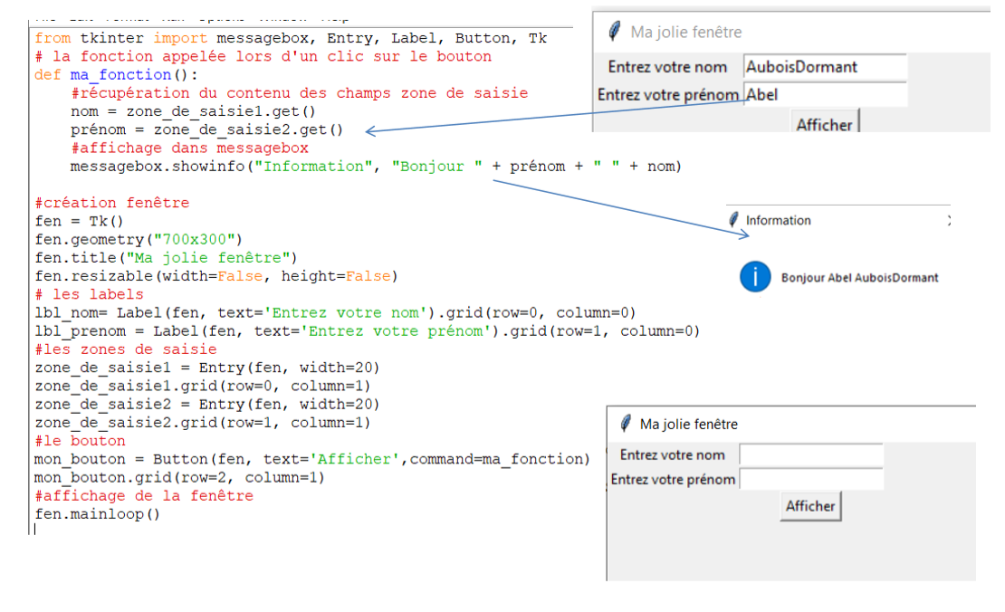 Exemple de récupération du contenu d'une Entry puis affichage des données récupérées dans une messagebox: